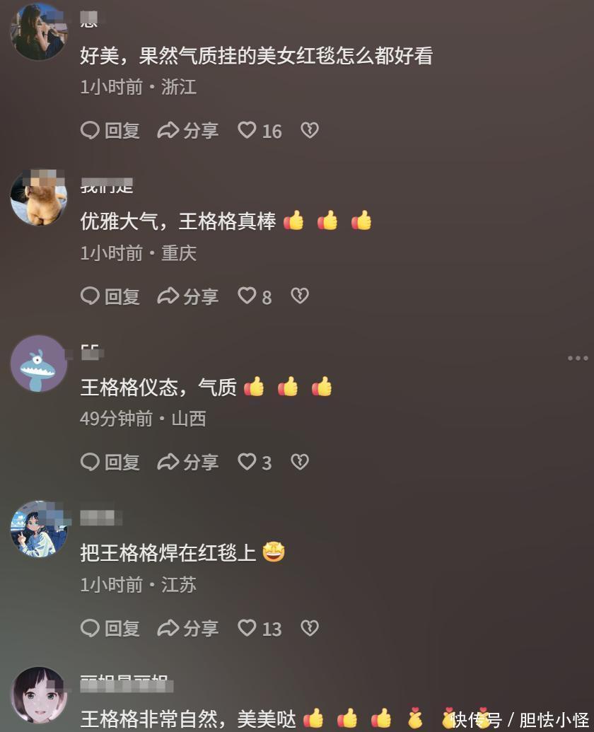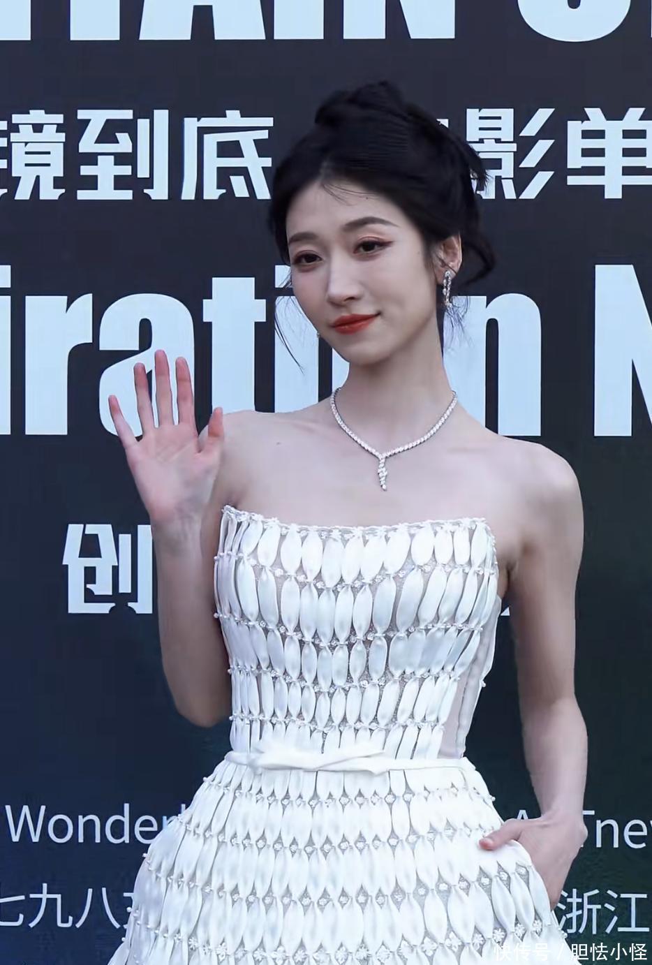 自信,是她身上很吸引人的点。四月份的国际电影节,同样是众星云集,王格格穿着白色的抹裙胸登场,定点拍照,整理好裙摆,向摄影师们挥手互动,眼神笃定,神态丛容,是一种“我就是巨星”的高雅大气。